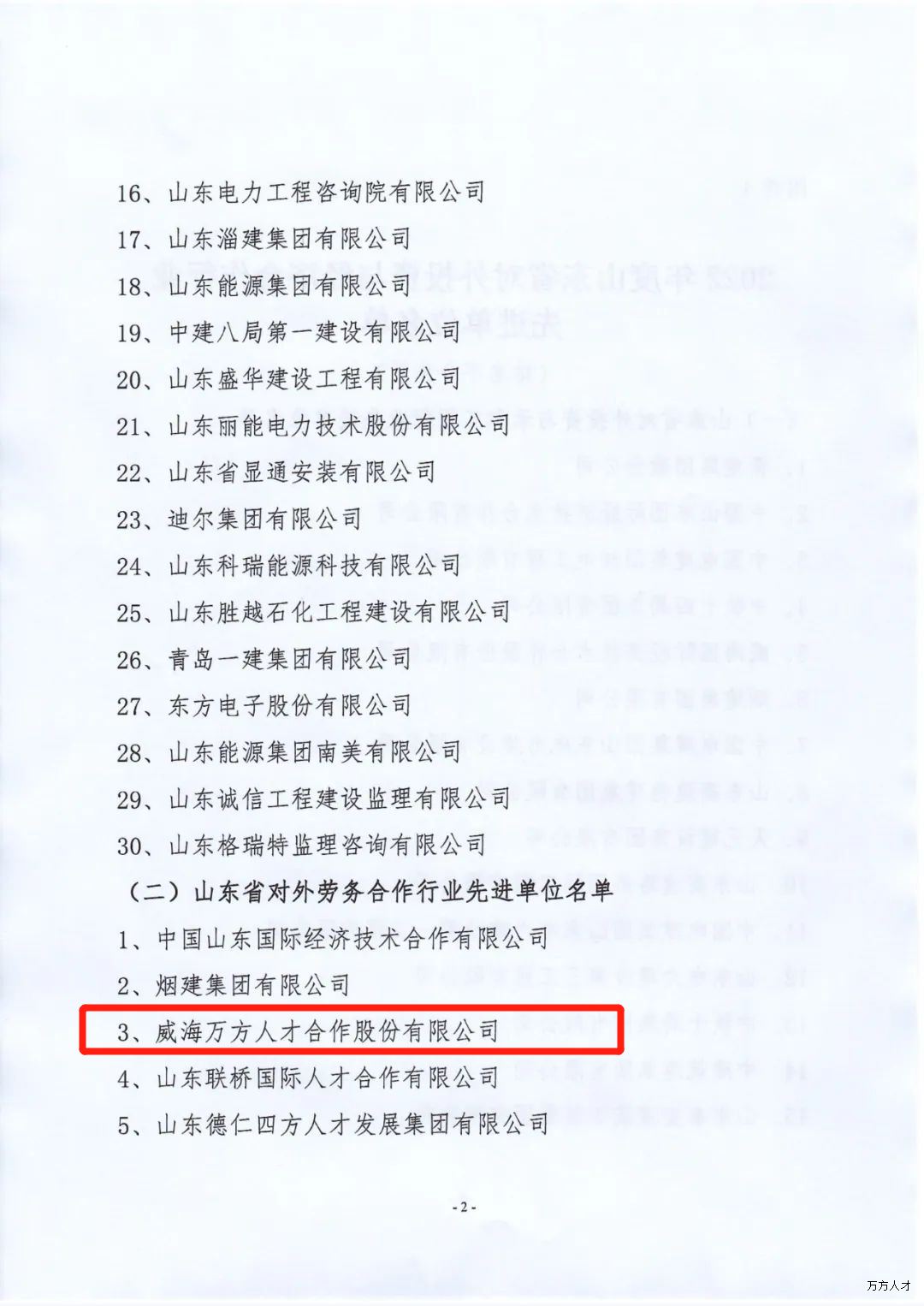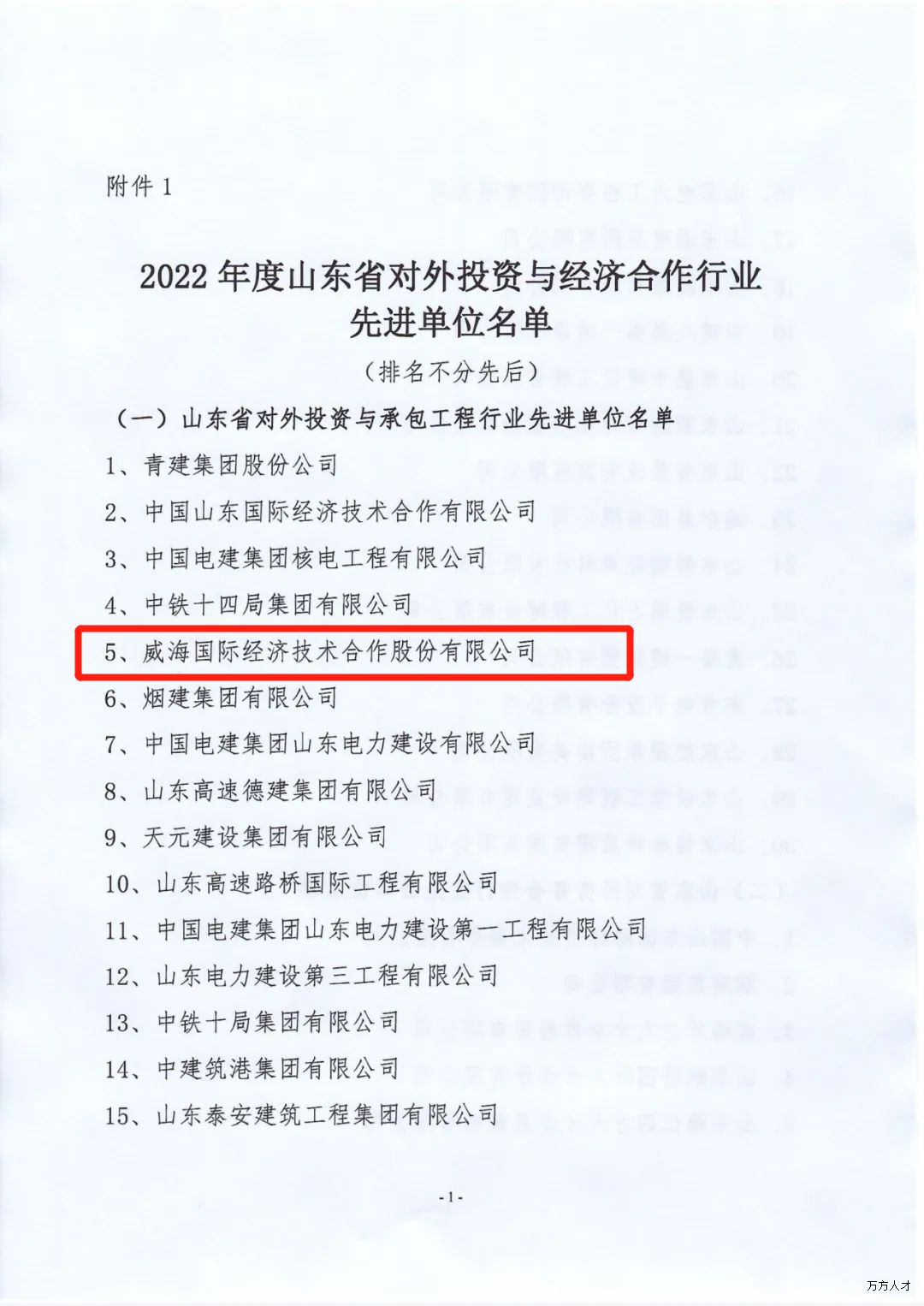 2月13日山東省對(duì)外投資與經(jīng)濟(jì)合作商會(huì)公布了《2022年度對(duì)外投資與經(jīng)濟(jì)合作行業(yè)先進(jìn)單位》的評(píng)選結(jié)果,“威海萬方人才合作股份有限公司”成功入選!